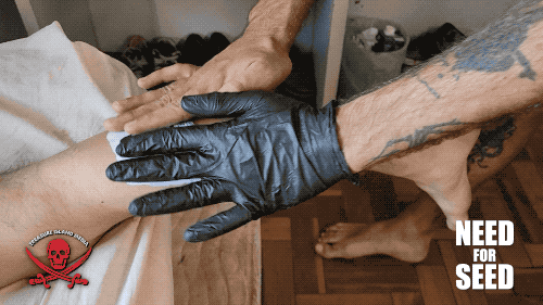 It worked. BRUNO HIGH can’t resist and tosses him down on the bed and fucks him before turning to the business of giving Lukas a Treasure Island Media logo tattoo on his leg.